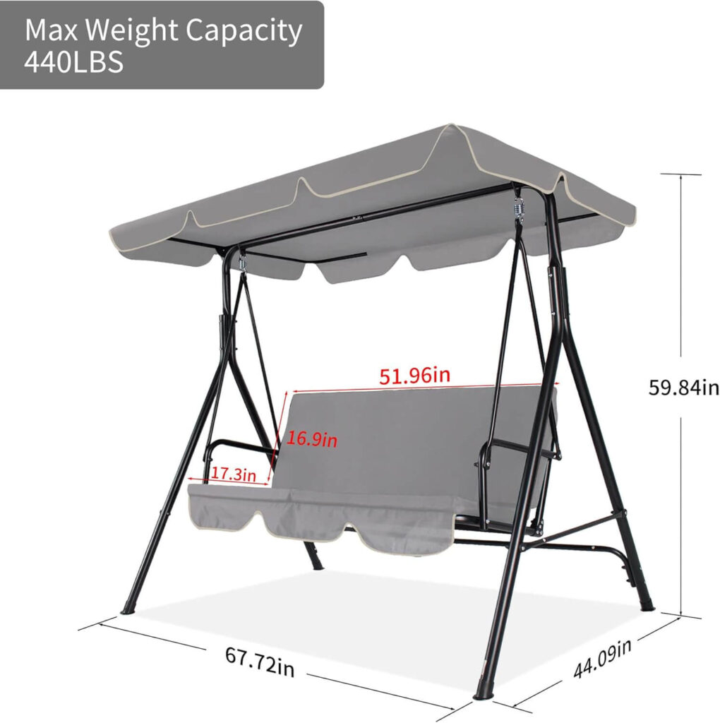 Spacious Seating: Generously sized at 68.5″(H) x 74.4″(W) x 50.3″(D), this swing comfortably accommodates up to three people for shared relaxation.