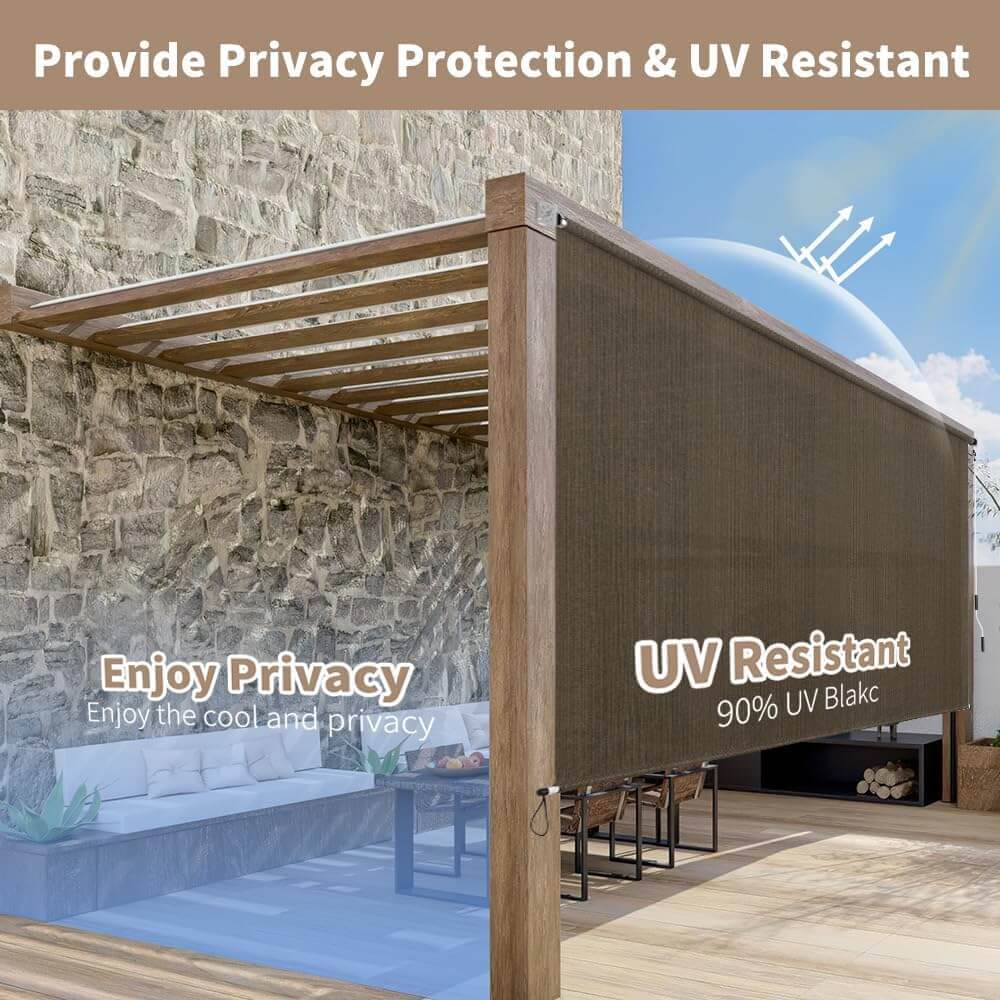 Enhance your patio or porch with this durable 8-ft outdoor roller shade, crafted to block up to 90% of UV rays while providing privacy and a comfortable atmosphere. The HDPE double-knitted fabric and sturdy aluminum frame ensure long-lasting performance, even in sunny or windy conditions. Customers note the easy installation, attractive finish, and reliable sun protection, making it a practical and stylish addition to any outdoor space.