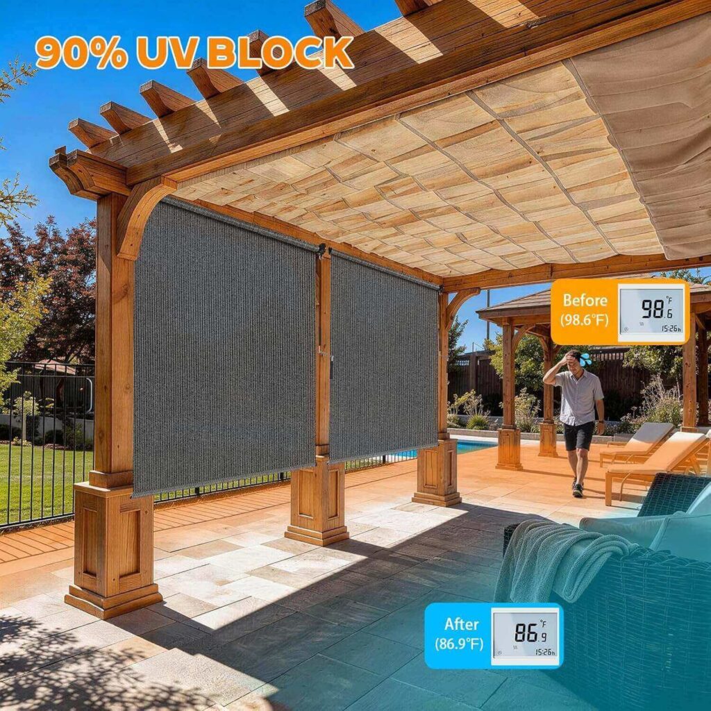 Enhance your patio or porch with the Artpuch 10-ft outdoor roller shade, designed to block 90% of UV rays while keeping your space cooler and more comfortable. The spliced pole design and durable HDPE fabric ensure strength, wind resistance, and long-lasting performance. Users highlight the easy assembly, effective sun and heat protection, and how it holds up well even in strong winds, making it a reliable outdoor addition.