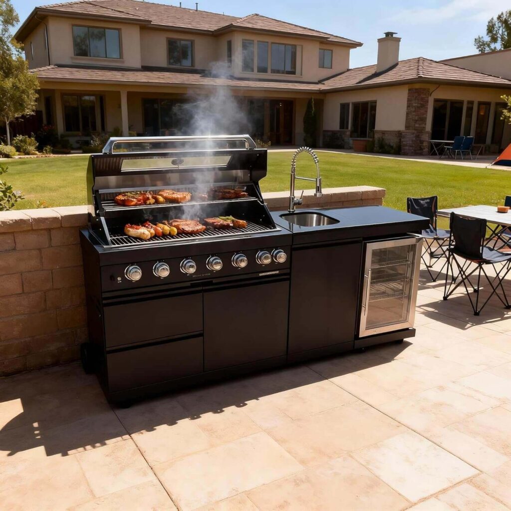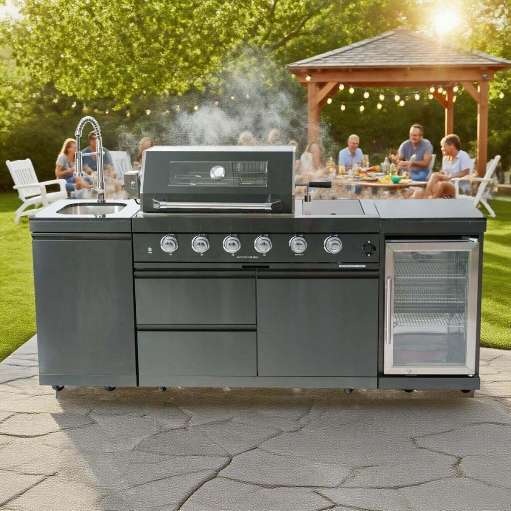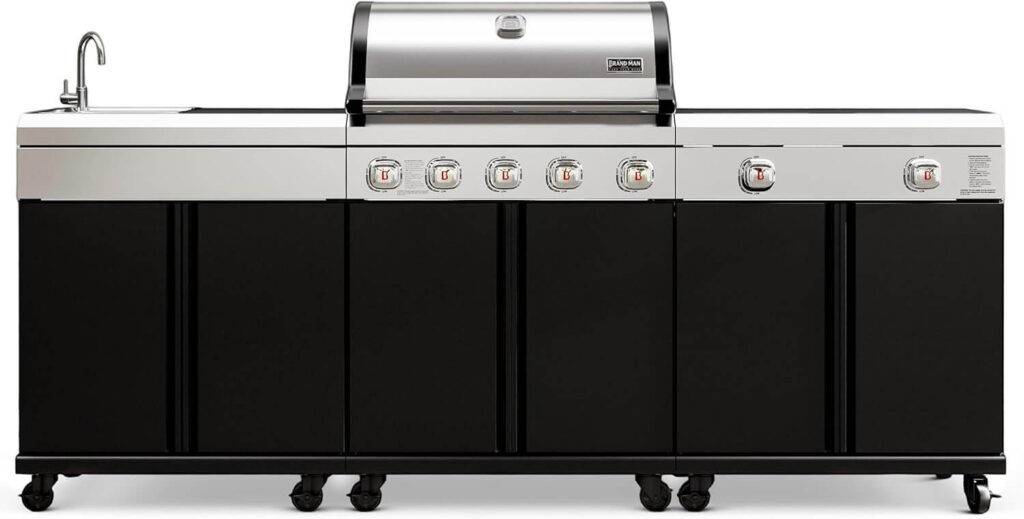 This modular outdoor kitchen offers a full cooking setup with a 5-burner grill, flat-top griddle, dual-zone cooktop, infrared sear burner, and built-in stainless steel sink. With 995 sq. in. of space and multi-zone control, it heats evenly and delivers powerful, high-heat performance. Customers love its sharp look, strong heat output, smooth ignition, and the impressive amount of cooking space. Many mention that assembly takes time but the quality, features, and responsive customer support make it an excellent long-term buy.
