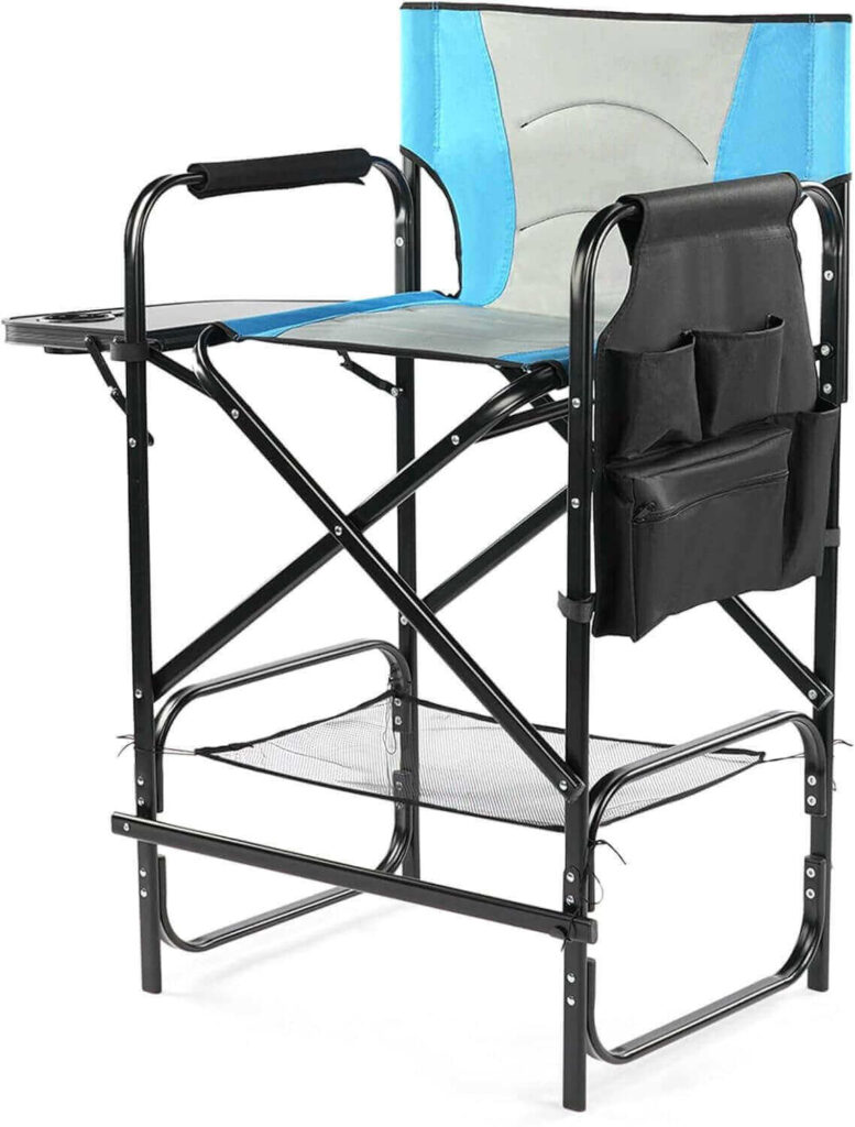 This 31″ bar-height folding director’s chair offers easy sit-to-stand comfort with a wide seat and detachable footrest. Designed with thick Oxford fabric, foam-padded armrests, and a stable frame for all-day support. A retractable side table with cup holder and side pocket keep essentials within reach. Quick to fold and easy to carry, it’s perfect for makeup artists, camping, outdoor events, or patio use.