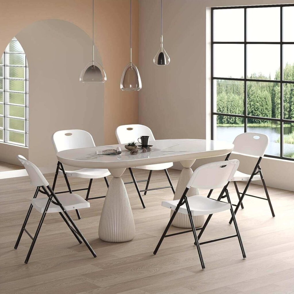 These 10-pack folding chairs are made from high-quality polypropylene with a durable powder-coated steel frame, supporting up to 650 lbs. The curved seat and backrest provide ergonomic comfort for long periods, while the foldable design makes them easy to store and transport. Lightweight yet sturdy, they’re ideal for indoor or outdoor use at home, parties, picnics, or camping. Users appreciate the smooth folding mechanism, professional white finish, and overall stability. Comfortable, practical, and reliable, these chairs are perfect for extra seating whenever needed.