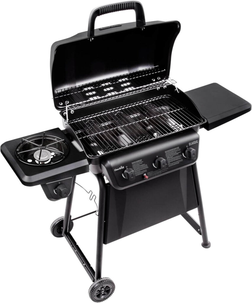 Grill with ease on this propane gas grill, featuring 360 sq. in. cooking space, a warming rack, and an 8,000 BTU side burner for sides or sauces. Porcelain-coated grates and removable grease tray make cleanup simple and efficient. Customers love its size and performance for small groups, noting that while assembly takes time, it’s well worth the effort for everyday grilling.