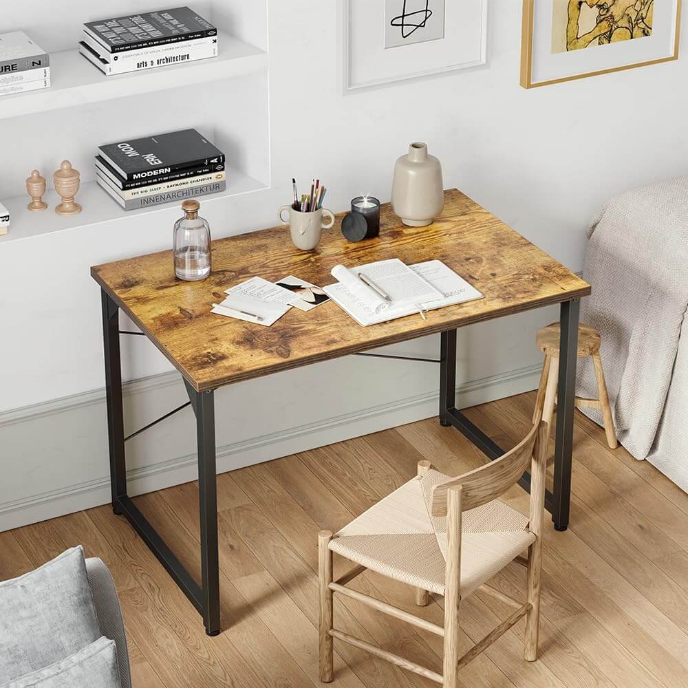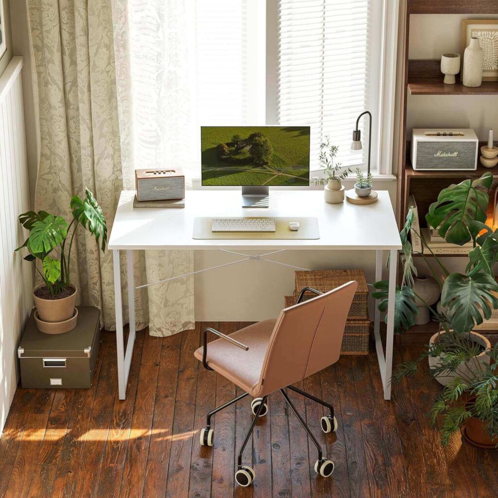 This modern computer desk blends effortlessly with different home styles while offering a clean, spacious work surface. The scratch-resistant, waterproof desktop handles daily use and stays easy to maintain. Built with a strong steel frame and X-shaped crossbar, it feels stable even in compact setups. Many users appreciate the simple assembly, solid feel, and great value for small workspaces.