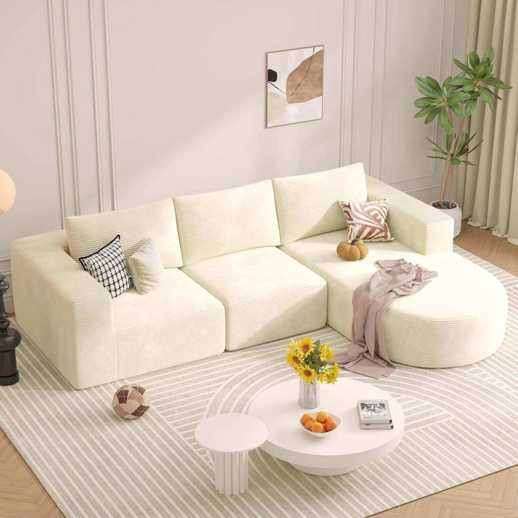 A modern favorite for flexible living, this boneless modular sofa adapts easily into L-shape, U-shape, or separate seating while offering cloud-like deep cushions and full pillow support. Soft, durable corduroy upholstery makes it cozy yet easy to clean, perfect for everyday lounging or family time. Customer reviewers love the stylish low-profile design, comfortable seating, and how effortlessly it fits and enhances their space.