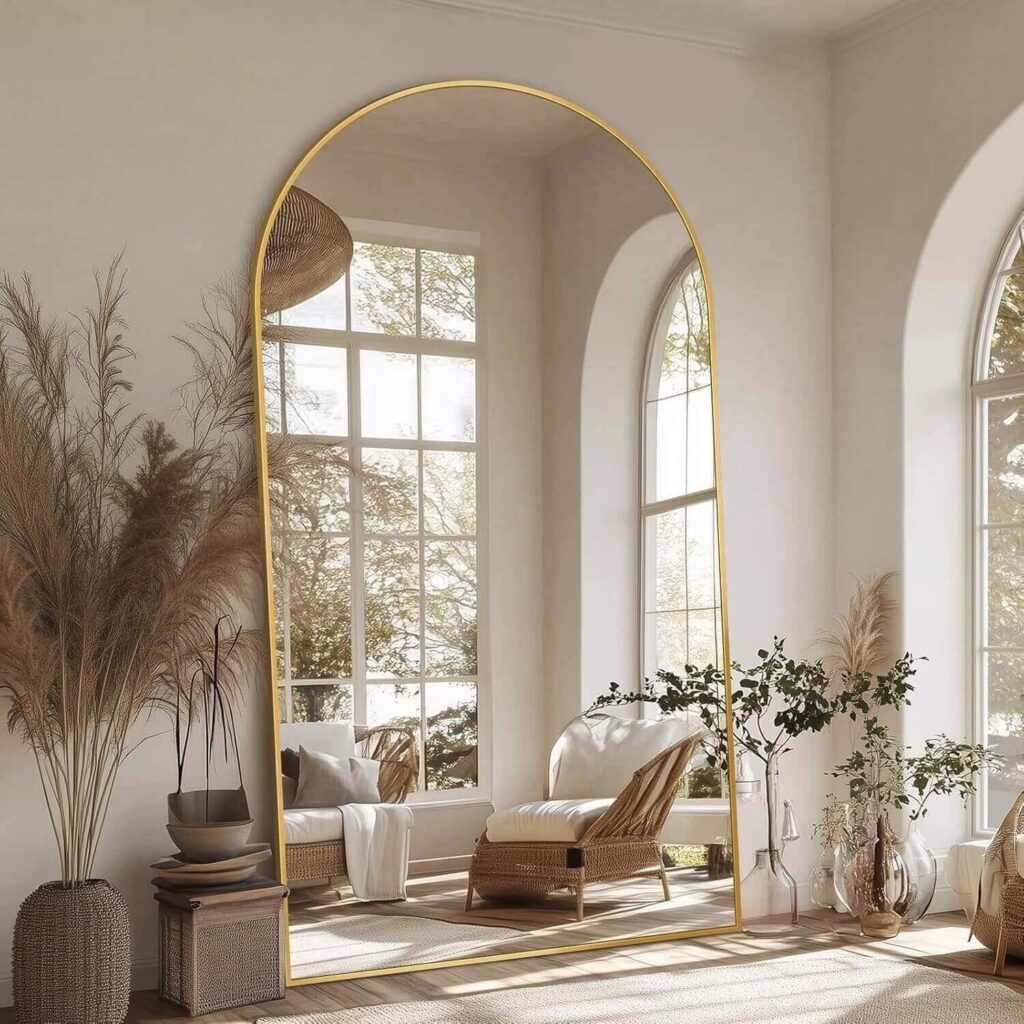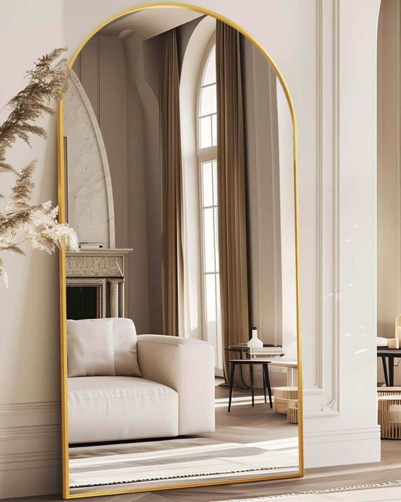 Add elegance and functionality to your room with this 91″x46″ Full-Length Arched Mirror (Color:Gold). Its sleek aluminum frame and arched design create a classy look while remaining lightweight and easy to move. Made with HD-imaging, explosion-proof glass, it ensures clear reflections and safe use. Customers love how it brightens their space, fits perfectly, and feels sturdy, with many praising the secure packaging and quick delivery. Versatile for standing or wall-mounting, it’s a stylish addition that enhances any room instantly.