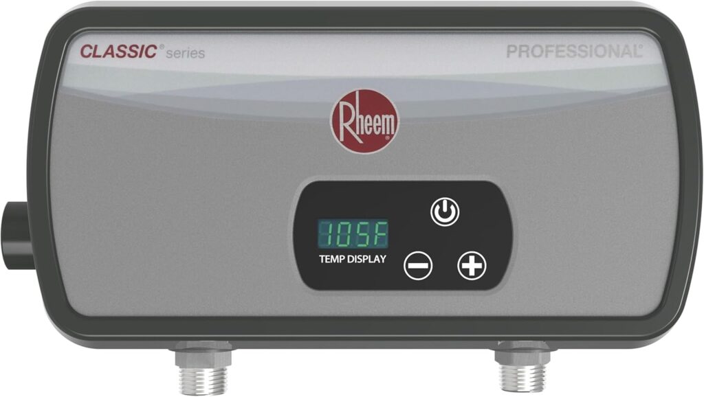 The Rheem Professional POU T Tankless Water Heater delivers endless hot water on demand, maintaining consistent temperatures within 1°F. Its compact design saves space, making it ideal for point-of-use installation, and it only heats water when needed for energy efficiency. Users love how easy it is to install and how reliably it keeps water hot, even for a 3-bedroom, 2-bath home.