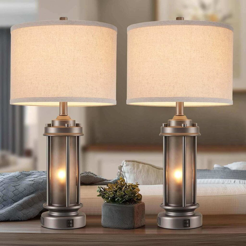 The AIEAMPDO table lamp (Color:Gray;Size:set of 2) combines industrial and vintage style with a grey metal base, linen shade, and frosted glass night light for a warm, soft glow. It features dual light sources with separate switches, providing bright light for reading or work and a gentle night light for relaxation. Built-in USB ports allow convenient device charging even when the lamp is off, and four included bulbs offer flicker-free, eye-friendly illumination. Customers love its sturdy design, elegant look, and practical features, noting it enhances the bedroom décor beautifully. Many praise the easy-to-use switches and soft lighting for creating a cozy atmosphere.