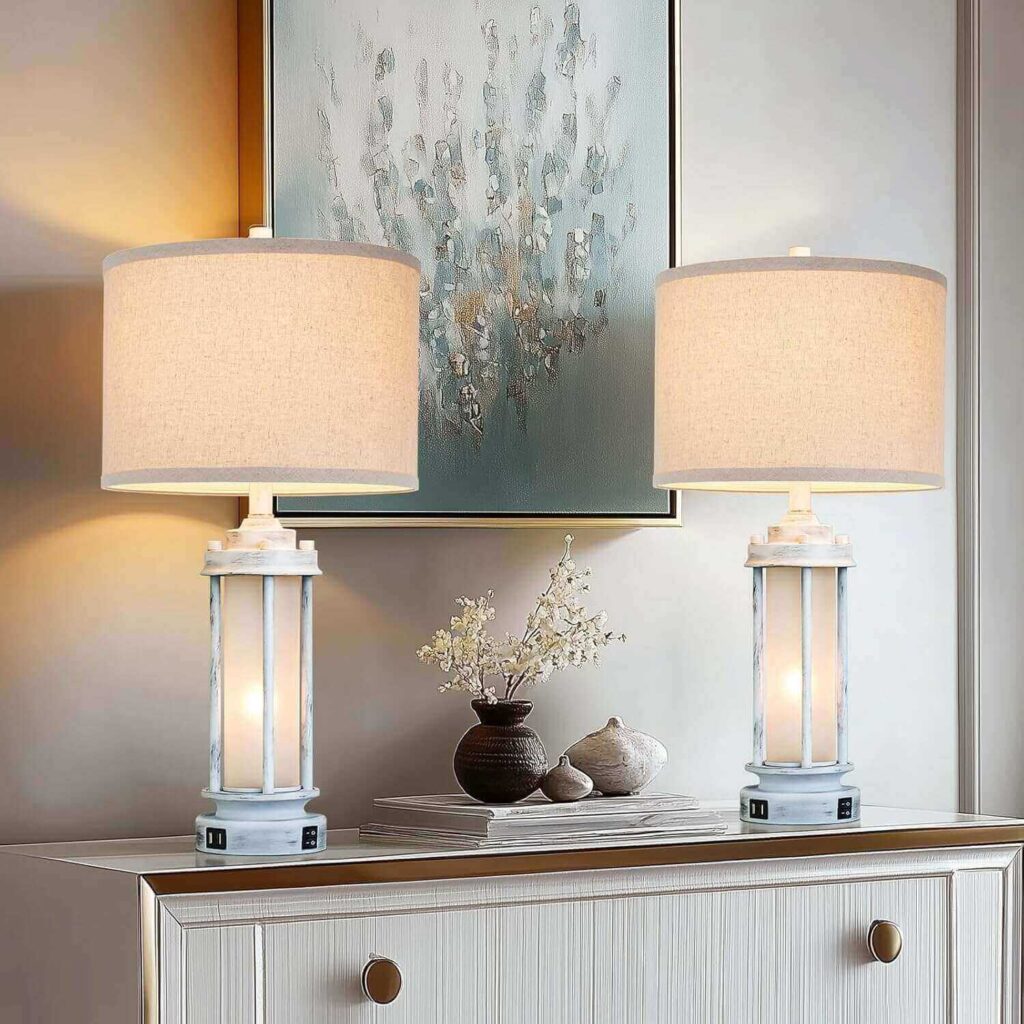 The AIEAMPDO table lamp (Color:Antique White;Size:set of 2) combines industrial and vintage style with a white metal base, linen shade, and frosted glass night light for a warm, soft glow. It features dual light sources with separate switches, providing bright light for reading or work and a gentle night light for relaxation. Built-in USB ports allow convenient device charging even when the lamp is off, and four included bulbs offer flicker-free, eye-friendly illumination. Customers love its sturdy design, elegant look, and practical features, noting it enhances the bedroom décor beautifully. Many praise the easy-to-use switches and soft lighting for creating a cozy atmosphere.