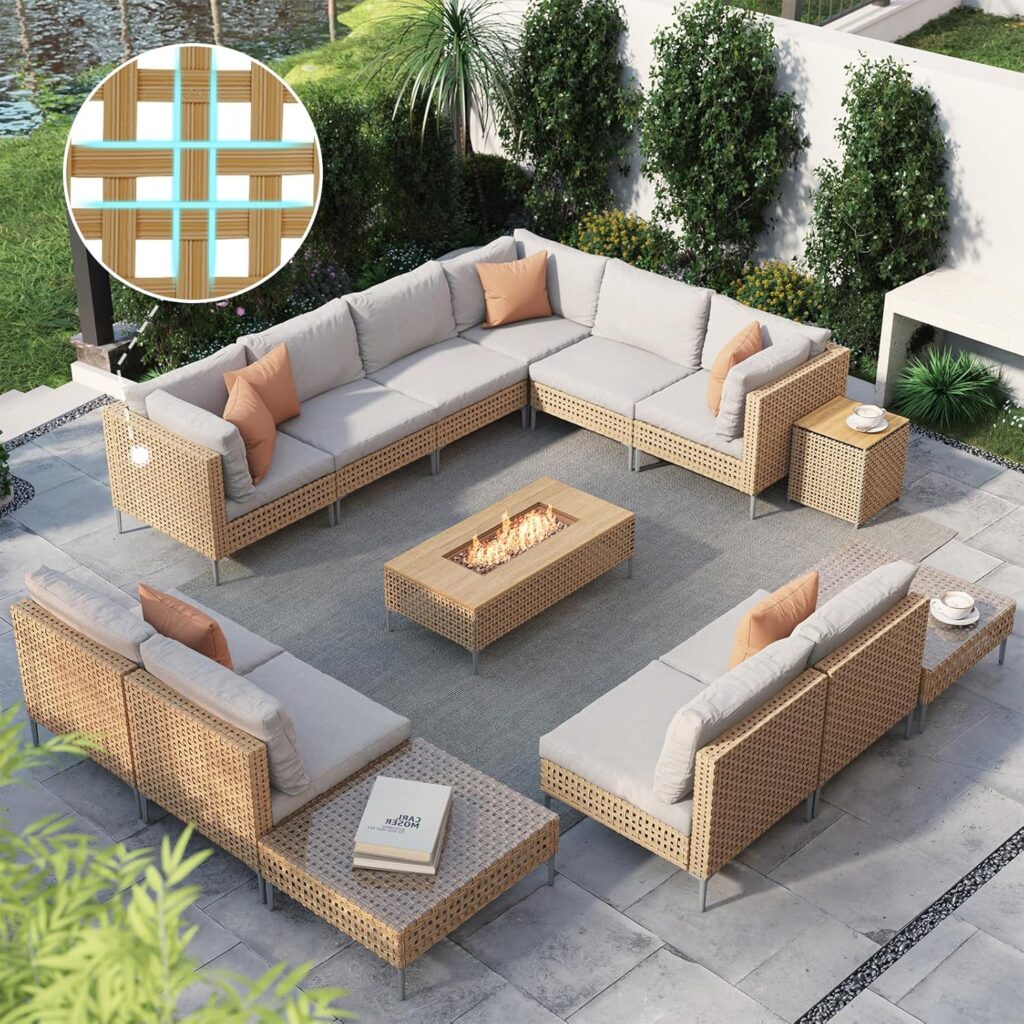The Grand Patio 14-Piece Outdoor Conversation Set with Fire Pit is perfect for a stylish and cozy outdoor lounge. Its boho-modern design, modular seating, and low fire table make it ideal for patios, decks, gardens, or poolside spaces.