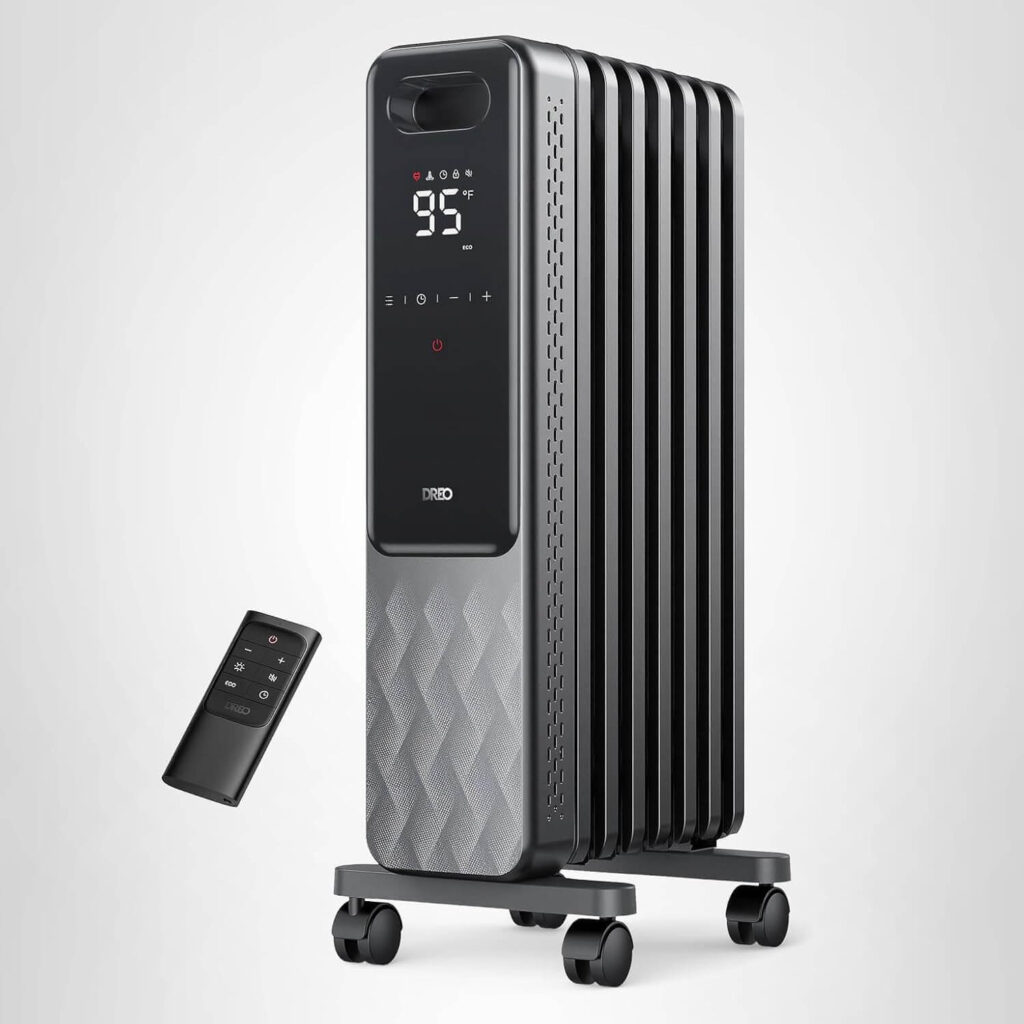 Stay warm and cozy with the Dreo 1500W oil-filled radiator heater, designed to provide 360° even heat for large rooms. Its advanced fins and silent operation deliver steady, efficient warmth, while multiple safety features—including tilt protection, fire-resistant materials, and overheat safeguards—ensure worry-free use. With adjustable power modes and ECO settings, it maintains your ideal temperature while saving energy. User-friendly features like a large LED display, touchscreen, remote control, caster wheels, and timer make it easy to move and operate. Customers appreciate its quiet, consistent heat, simple setup, and ability to warm larger spaces effectively, making it ideal for bedrooms, offices, or hobby rooms.