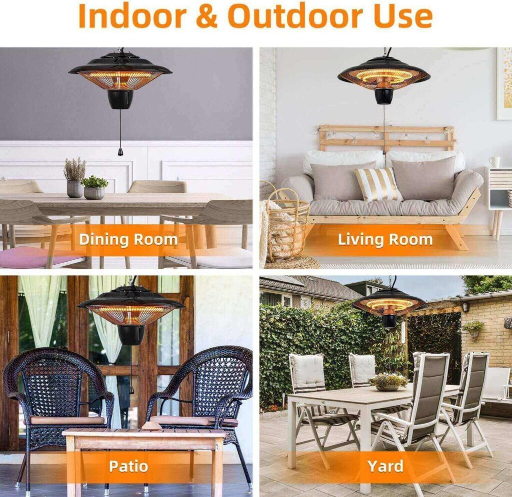 This hanging halogen heater delivers quick, powerful warmth with a 1500W output, heating the space in just a few seconds. The fanless design keeps it ultra quiet, making it great for relaxing, working, or sleeping without disturbance. Its IP23 waterproof rating allows safe use outdoors in light rain or cold conditions. Easy pull-cord operation and an adjustable hanging chain make setup simple and flexible. Built-in overheat protection adds extra peace of mind for everyday use.